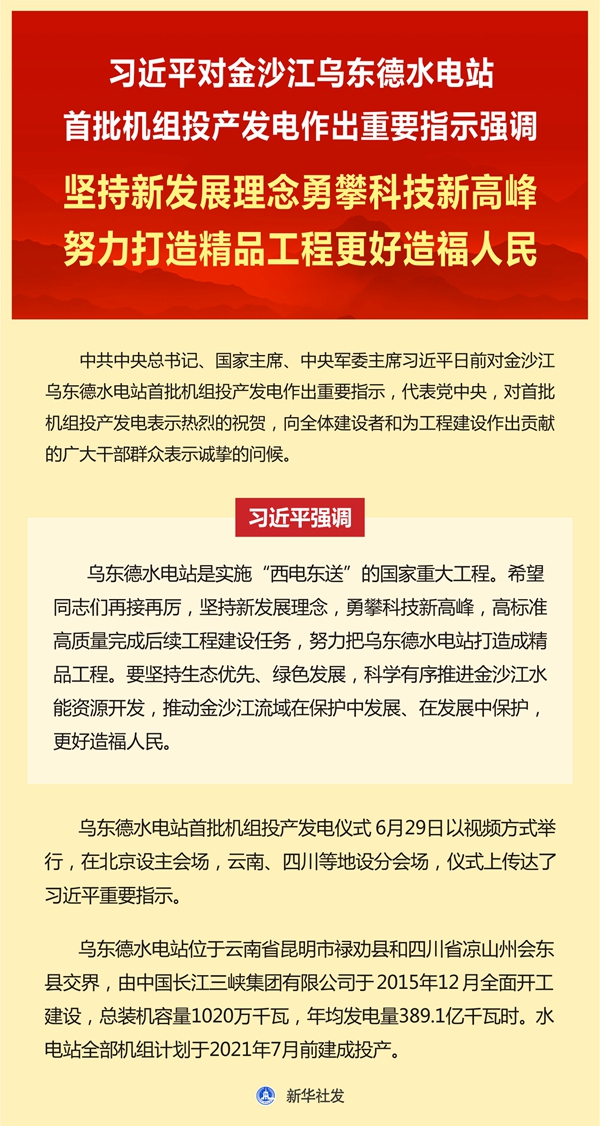 新華社北京6月29日電 中共中央總書記、國家主席、中央軍委主席習(xí)近平日前對(duì)金沙江烏東德水電站首批機(jī)組投產(chǎn)發(fā)電作出重要指示,代表黨中央,對(duì)首批機(jī)組投產(chǎn)發(fā)電表示熱烈的祝賀,向全體建設(shè)者和為工程建設(shè)作出貢獻(xiàn)的廣大干部群眾表示誠摯的問候。 習(xí)近平強(qiáng)調(diào),烏東德水電站是實(shí)施“西電東送”的國家重大工程。希望同志們?cè)俳釉賲?,?jiān)持新發(fā)展理念,勇攀科技新高峰,高標(biāo)準(zhǔn)高質(zhì)量完成后續(xù)工程建設(shè)任務(wù),努力把烏東德水電站打造成精品工程。要堅(jiān)持生態(tài)優(yōu)先、綠色發(fā)展,科學(xué)有序推進(jìn)金沙江水能資源開發(fā),推動(dòng)金沙江流域在保護(hù)中發(fā)展、在發(fā)展中保護(hù),更好造福人民。 烏東德水電站首批機(jī)組投產(chǎn)發(fā)電儀式29日以視頻方式舉行,在北京設(shè)主會(huì)場,云南、四川等地設(shè)分會(huì)場,儀式上傳達(dá)了習(xí)近平重要指示。 烏東德水電站位于云南省昆明市祿勸縣和四川省涼山州會(huì)東縣交界,由中國長江三峽集團(tuán)有限公司于2015年12月全面開工建設(shè),總裝機(jī)容量1020萬千瓦,年均發(fā)電量389.1億千瓦時(shí)。水電站全部機(jī)組計(jì)劃于2021年7月前建成投產(chǎn)。