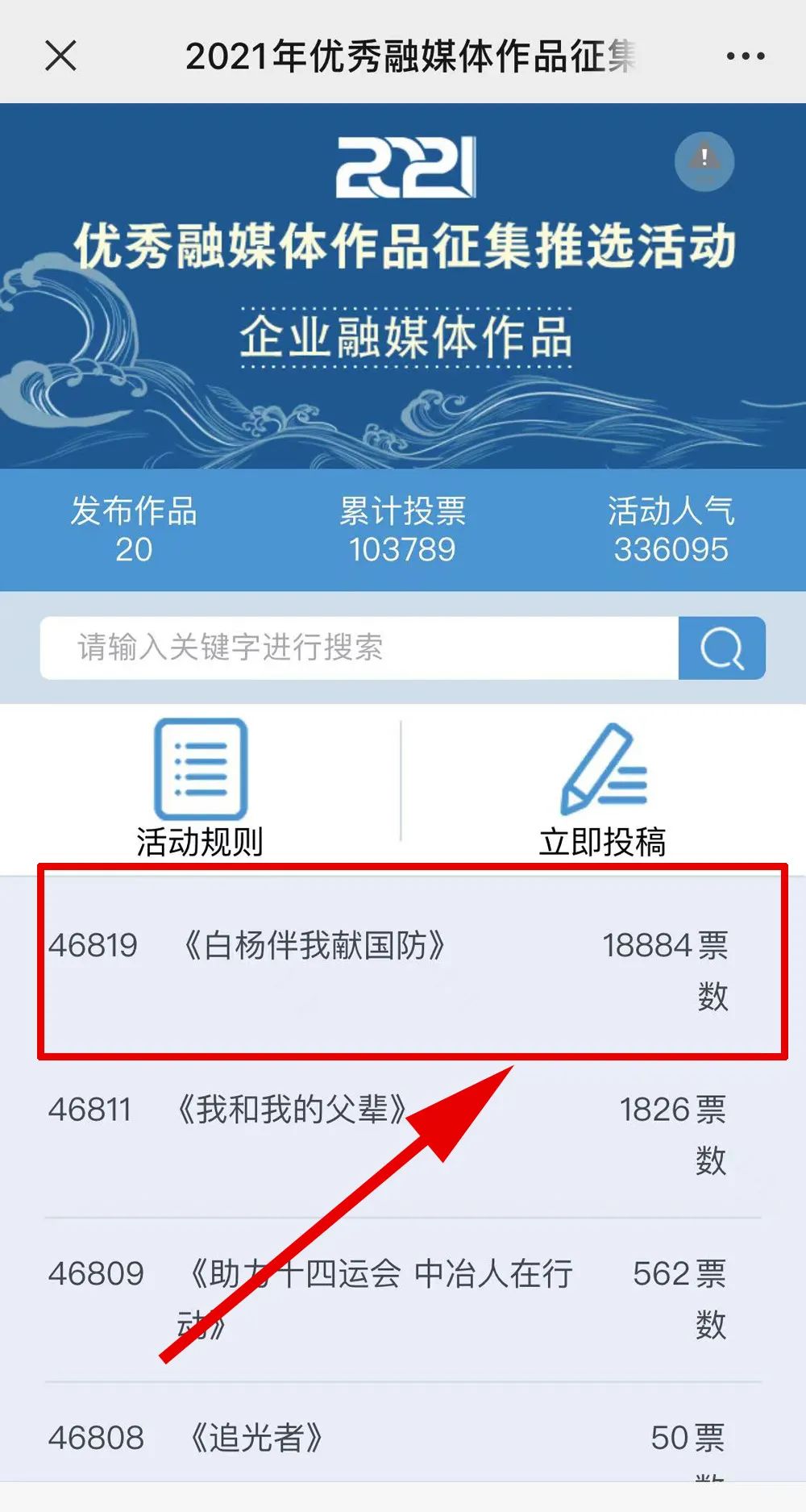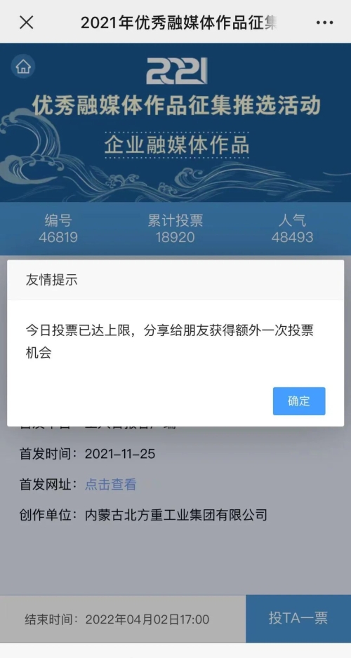 近日,由“文化強(qiáng)國”光明日報(bào)協(xié)同推廣平臺、光明網(wǎng)、北京師范大學(xué)新媒體傳播研究中心和光明天翼5G融媒實(shí)驗(yàn)室共同主辦的“2021年優(yōu)秀融媒體作品征集推選活動(dòng)”開啟線上投票環(huán)節(jié),經(jīng)過專家委員會評審,中國兵器工業(yè)集團(tuán)北重集團(tuán)《白楊伴我獻(xiàn)國防》音樂MV入選活動(dòng)前二十名,并進(jìn)入網(wǎng)絡(luò)投票環(huán)節(jié)。 《白楊伴我獻(xiàn)國防》 楊樹參天 高聳云端的是兵工人 “履行好強(qiáng)軍首責(zé)”的壯志凌云! 深植北疆 傾獻(xiàn)沃土的是北重人 “推動(dòng)高質(zhì)量發(fā)展”的壯志豪情! 白楊樹伴著我們茁壯成長 見證著我們獻(xiàn)身國防! 投票方式 1.掃描下方二維碼,進(jìn)入初始界面,點(diǎn)擊“企業(yè)融媒體作品征集”,進(jìn)入投票界面點(diǎn)擊《白楊伴我獻(xiàn)國防》,點(diǎn)擊“投TA一票”; 2. 每人每日可投10票,直至提示投票達(dá)到上限即可; 3.投票時(shí)間:2022年3月17日09:00-2022年4月2日17:00。 來源/光明網(wǎng)、北重集團(tuán) |