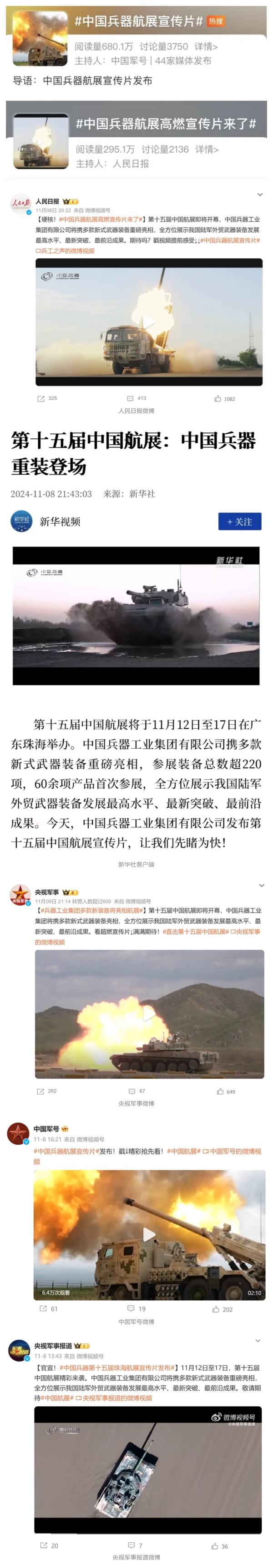 人民日報微博、新華社客戶端、央視軍事微博、中國軍號微博、央視軍事報道微博、中國日報微博、中國新聞網(wǎng)、中國青年報-青蜂俠、環(huán)球網(wǎng)、環(huán)球時報(臉書、X平臺)、學(xué)習強國中央企業(yè)學(xué)習平臺、共青團中央微博、國資委網(wǎng)站等20余家中央主流媒體、國家部委的新媒體第一時間播發(fā)集團公司航展宣傳片等視頻作品燃爆全網(wǎng),累計閱讀量突破1200萬人次。集團公司微信公眾號、微博、抖音號、快手號、微信視頻號、知乎號等新媒體宣傳片播放閱讀量近1000萬人次,點贊近20萬人次。