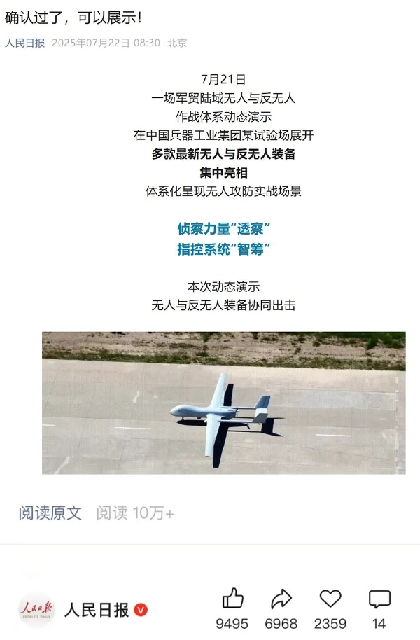 7月21日,中國(guó)兵器工業(yè)集團(tuán)有限公司在位于內(nèi)蒙古的某試驗(yàn)場(chǎng)舉辦軍貿(mào)陸域無人與反無人作戰(zhàn)體系主題日活動(dòng),攜無人機(jī)、巡飛彈、反無人機(jī)等最新武器裝備登場(chǎng)亮相,展現(xiàn)了一場(chǎng)無人與反無人領(lǐng)域激烈對(duì)抗的實(shí)戰(zhàn)場(chǎng)景。中央主流媒體、地方媒體、知名網(wǎng)絡(luò)媒體,以及集團(tuán)公司各宣傳平臺(tái)紛紛進(jìn)行報(bào)道,多次登上熱搜,引發(fā)廣泛關(guān)注。 央視新聞?lì)l道《新聞直播間》《東方時(shí)空》《24小時(shí)》、國(guó)防軍事頻道《正午國(guó)防軍事》《軍事報(bào)道》《國(guó)防軍事早報(bào)》、中文國(guó)際頻道《今日環(huán)球》、央視軍事新媒體等報(bào)道了集團(tuán)公司軍貿(mào)陸域無人與反無人作戰(zhàn)體系首次公開實(shí)裝動(dòng)態(tài)演示有關(guān)情況,重點(diǎn)介紹了無人與反無人作戰(zhàn)最新裝備。 央視新聞?lì)l道《新聞直播間》:內(nèi)蒙古 軍貿(mào)陸域無人與反無人作戰(zhàn)最新裝備亮相 央視新聞?lì)l道《新聞直播間》:內(nèi)蒙古 軍貿(mào)陸域無人與反無人作戰(zhàn)最新裝備亮相 記者探訪無人裝備展區(qū) 央視新聞?lì)l道《新聞直播間》:軍貿(mào)陸域無人與反無人作戰(zhàn)最新裝備亮相·記者探訪 最強(qiáng)“盾牌” 反無人機(jī)系統(tǒng)新升級(jí) 人民日?qǐng)?bào)微博、央視軍事微博、央視新聞客戶端、中國(guó)新聞網(wǎng)、中新社國(guó)是直通車抖音、環(huán)球網(wǎng)微博、環(huán)球時(shí)報(bào)(X平臺(tái)、英文版客戶端)、中國(guó)日?qǐng)?bào)網(wǎng)、央視軍事報(bào)道微博、中國(guó)軍號(hào)微博、中央廣播電視總臺(tái)“空天逐夢(mèng)”微信視頻號(hào)、共青團(tuán)中央B站、國(guó)資小新微博等中央主流媒體、國(guó)家部委的新媒體播發(fā)集團(tuán)公司陸域無人與反無人作戰(zhàn)大片等視頻作品。 人民日?qǐng)?bào)微博 央視軍事微博 人民日?qǐng)?bào)、新華網(wǎng)、央視軍事、央視新聞、中央廣播電視總臺(tái)中國(guó)之聲、中國(guó)新聞網(wǎng)、中國(guó)日?qǐng)?bào)網(wǎng)、中國(guó)日?qǐng)?bào)英文報(bào)刊《CHINA DAILY》、《科技日?qǐng)?bào)》、光明日?qǐng)?bào)客戶端、環(huán)球網(wǎng)、環(huán)球時(shí)報(bào)、人民日?qǐng)?bào)海外版-海外網(wǎng)、央視網(wǎng)、小央視頻、參考消息、瞭望東方周刊、共青團(tuán)中央、國(guó)資小新新媒體、新浪網(wǎng)、騰訊網(wǎng)、搜狐網(wǎng)、鳳凰網(wǎng)、網(wǎng)易網(wǎng)等中央主流媒體、國(guó)家部委的新媒體及知名網(wǎng)絡(luò)媒體對(duì)集團(tuán)公司軍貿(mào)陸域無人與反無人作戰(zhàn)體系主題日活動(dòng)進(jìn)行了圖文、音頻、視頻報(bào)道。 央視軍事微信 人民日?qǐng)?bào)微信 新華網(wǎng)微信 來源/各主流媒體 |
